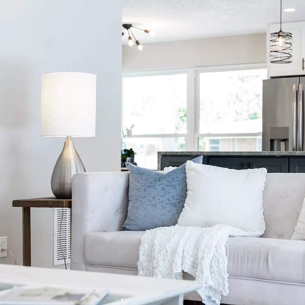 Create an impressive presence in any room with this modern table lamp.